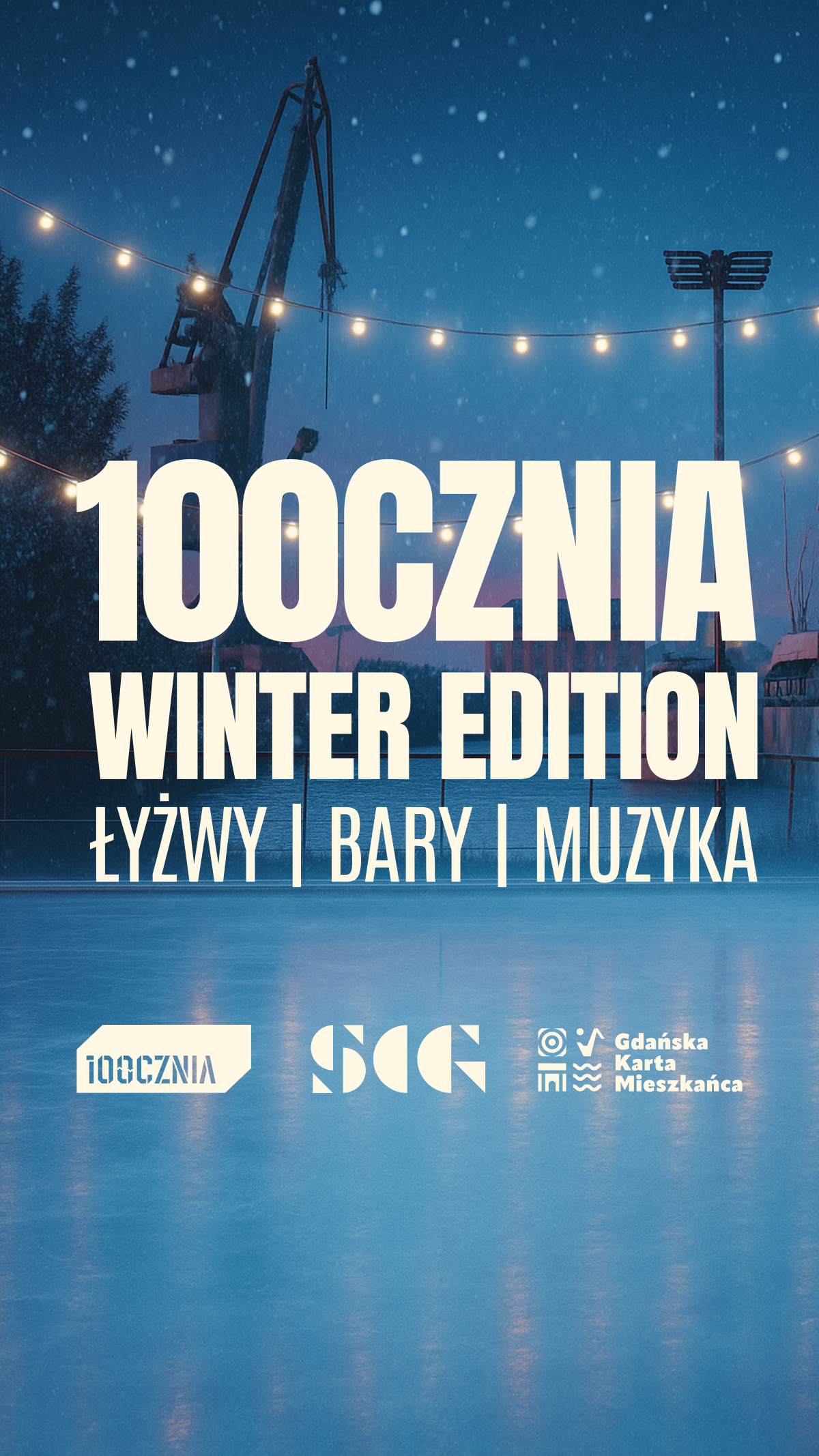 W sobotę, 13 grudnia startujemy ze 100cznia Winter Edition - w planie muzyka, miejski klimat i przede wszystkim 300 m² lodowiska pod samymi żurawiami, z widokiem na statki, stoczniowy kanał i odrestaurowaną halę 31B.